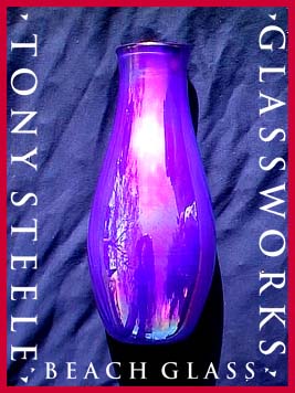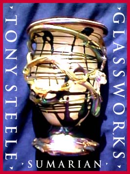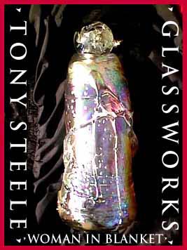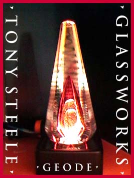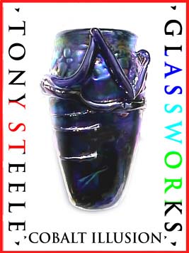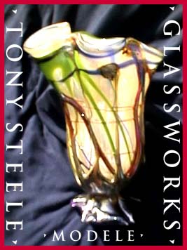 Tony Steele, a native of Quebec, Canada has been involved with the arts of Glass Blowing and Flat Glass for over 15 years. After graduatiing from U.C.L.A. with degrees in psychology and art, Tony chose to pursue the path of the artist. His background includes both commercial and creative photography, gold-smithing, stained glass and sculpture, with an emphasis placed on hand blown glass works. Varying in size, from smaller pieces such as perfume bottles to his larger scale creations, Tonys' works have garnered awards and hold places in the homes and offices of collectors in the United States as well as in the Netherlands, France, Japan and Guam, to name a few. Beginning with vivid colors, these pieces are further enhanced by the meticulous use of an irridizing technique and/or the application of selected precious metals fumed onto the surface of the glass. It is the subtle combination of techniques that has become Tonys' signature style. Never content, Tony is constantly exploring and utilizing new applications for enhancing texture, surface color, and size. It is no wonder then that he refers to his glass works as "organic", or something that a machine can not produce. Every new piece is the result of the artists' breath: therefore, every new shape and size reflects the artists' state of mind while creating: truly a case of "Mind over Matter".